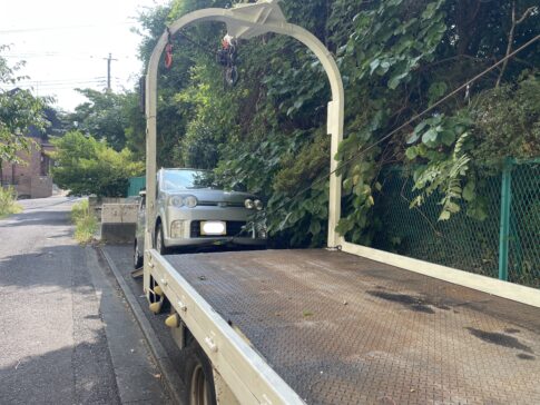 今回は、相模原市中央区内の月極駐車場から放置車両の引き取り作業でした。駐車場内に積載車が入れました。車のカギが無いのでハンドルロックを解除、積載車のウインチで放置車両を荷台に引っ張り上げました。